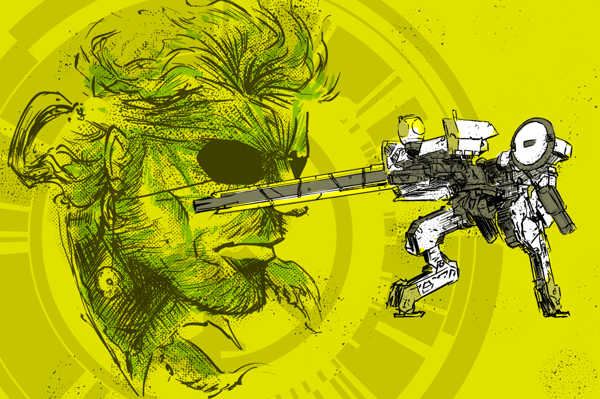 Inspired by the gripping era of the Cold War in Costa Rica, this piece spotlights Big Boss and the formidable mech, Peace Walker. My intent was to encapsulate the tension of the late '70s—a time rife with the threat of upheaval, captured here in the standoff between man and machine.