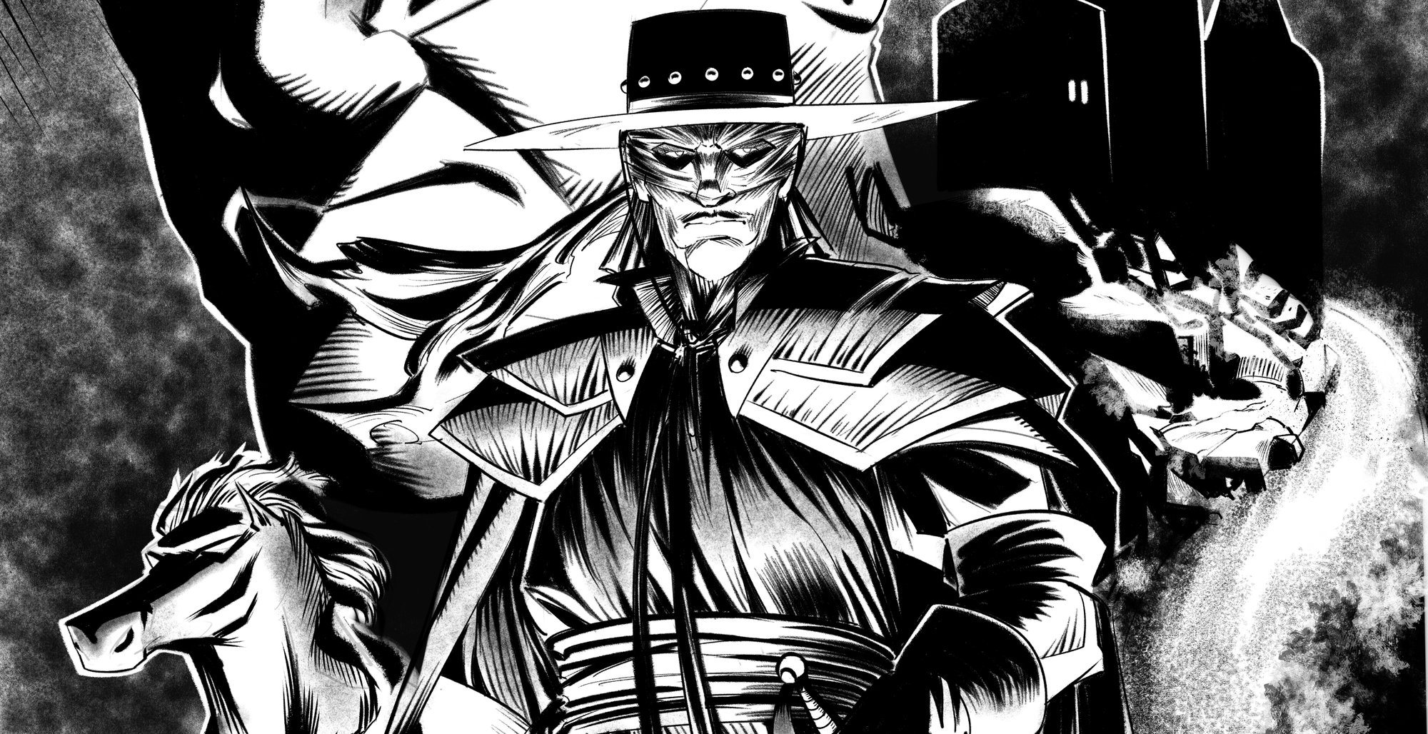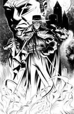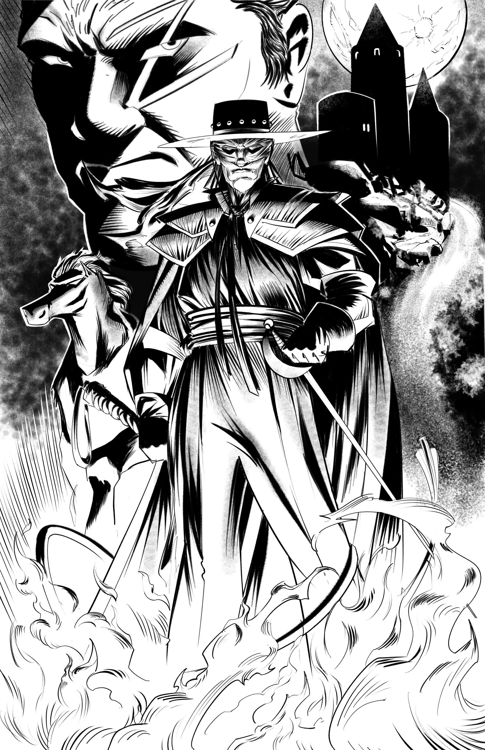 Introducing my Zorro tribute print, debuting at LA Comic Con 2023! I wanted to capture the essence of the legendary defender in a moment of calm amid the chaos. Zorro stands with Tornado by his side, unscathed by the flames that dance around them, a symbol of their unyielding spirit. The shadowy figure in the background, whom I've named The Hound, is marked by Zorro's signature over his eye, a source of drive for his schemes of revenge. Drawn with bold strokes and contrast, it's an homage to the hero who lives in the heart of every fan.